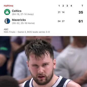 半场结束,独行侠领先26分,东欧组合合砍36分,而凯尔特人全队只得到35分。